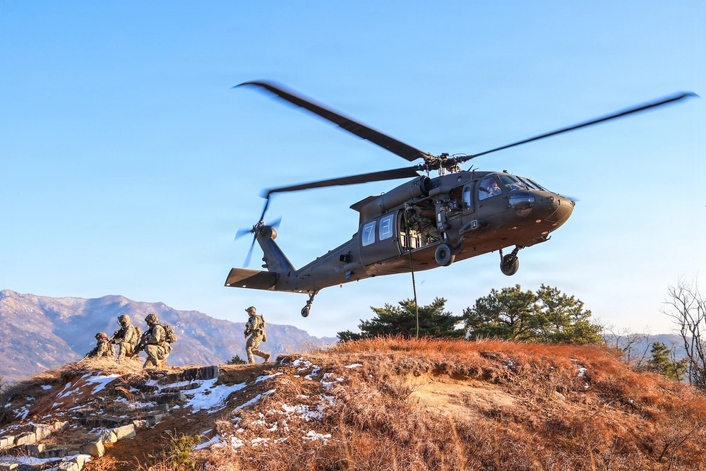 U.S. Army Soldiers assigned to 2nd Battalion, 2nd Aviation Regiment, 2nd Combat Aviation Brigade, 2d Infantry Division/ROK-U.S. Combined Division, alongside 1st Battalion, 38th Infantry Regiment, 1st Stryker Brigade Combat Team, 4th Infantry Division, conduct fast-rope air assault isolated personnel extraction training, Dec. 18, 2025. The training integrated aviation assets with infantry elements, as well as small unmanned aircraft systems and U.S. Air Force joint terminal attack controller capabilities, demonstrating 2CAB’s ability to operate with both conventional and unconventional joint forces in support of readiness across the Korean Peninsula. (U.S. Army photo by Staff Sgt. Nicholas Childers)