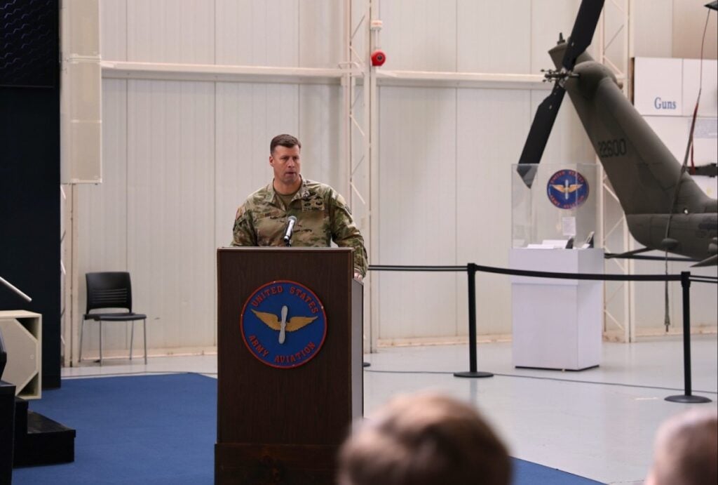 Maj. Gen. Clair A. Gill, Aviation Center of Excellence and Fort Rucker commanding general, speaks during the AVCOE 2025 Instructor of the Year Ceremony at Fort Rucker, Ala., Dec. 16, 2025. (U.S. Army photo by Kelly Morris)