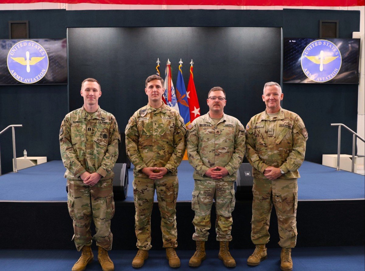 The Aviation Center of Excellence honors its Instructors of the Year for Fiscal Year 2025 in a ceremony at Fort Rucker, Ala., Dec. 16, 2025. The winners shown are: • The Officer Academic Instructor of the Year, Capt. Dakota R. Defreece, 1st Aviation Brigade • The Officer Flight Instructor of the Year, Chief Warrant Officer 3 Shawn D. Michael, 110th Aviation Brigade • The NCO Flight Instructor of the Year, Staff Sgt. Nicholas R. Dykeman, 110th Aviation Brigade • The Civilian Flight Instructor of the Year, Harley R. Mast, 110th Aviation Brigade Not pictured is the Noncommissioned Officer Academic Instructor of the Year, Staff Sgt. Tyler L. Finnigan, 128th Aviation Brigade, Joint Base Langley-Eustis, Va. (U.S. Army photo by Kelly Morris)