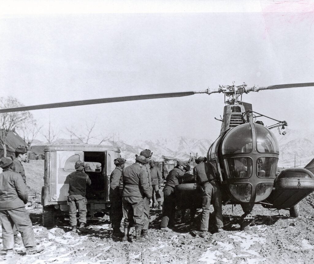 An OH-13, from the 25th Infantry Division, evacuating casualties during the Korean War.